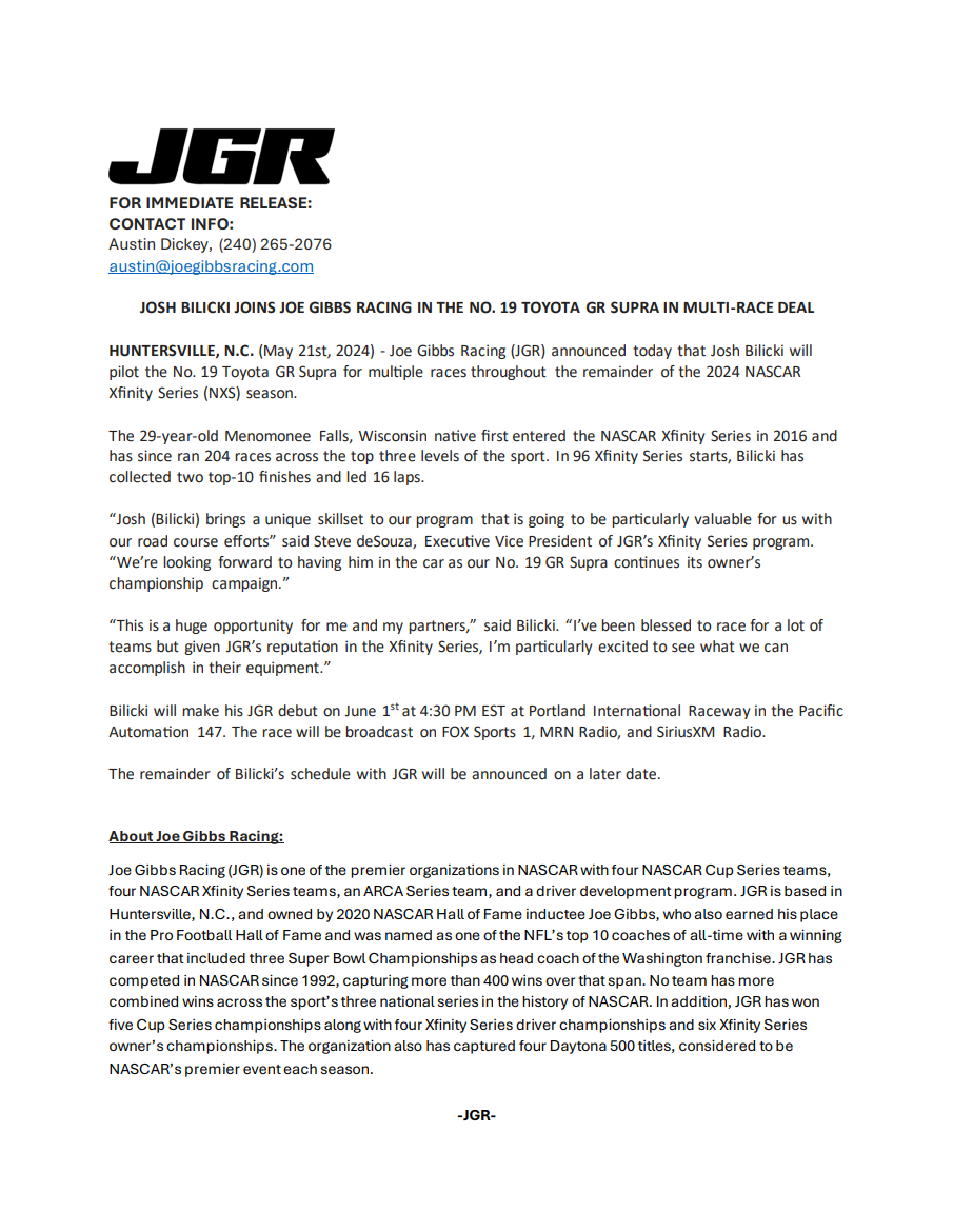 Joe Gibbs Racing Honoring Legacy of Coy Gibbs with New Alternate Team Logo