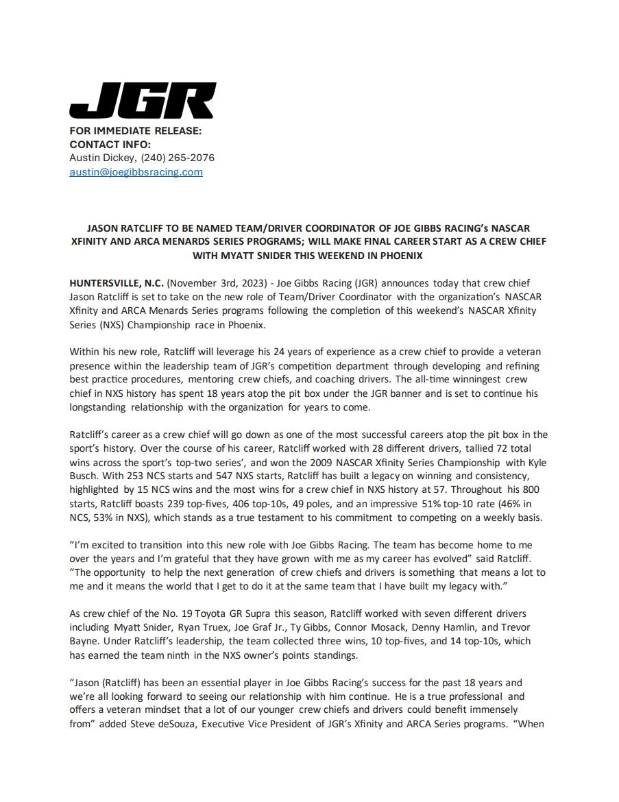 As decorated crew-chief career draws to a close, Jason Ratcliff ready for next chapter at JGR